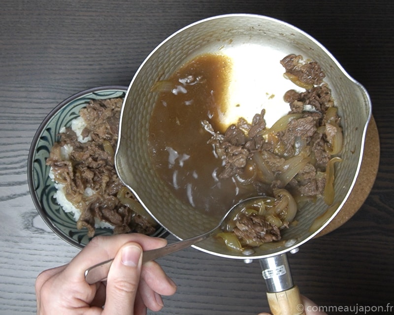 Le gyudon est un plat très populaire au Japon. En plus d’être délicieux, il est très facile à faire. Il suffit de faire mijoter de fines tranches de bœuf, oignons dans une sauce soja caramélisée et de verser le tout sur un bol de riz.