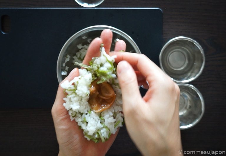 Il faut que le riz tienne ensemble mais il ne faut pas le compresser jusqu’à ce qu’il devienne une brique. Prenez la boule de riz dans vos mains et pressez la doucement 3-4 fois en la tournant. Si le riz tient ensemble, c’est réussi, sinon essayez encore quelques fois en pressant un peu plus. Après quelques boulettes, vous aurez pris l’habitude !
